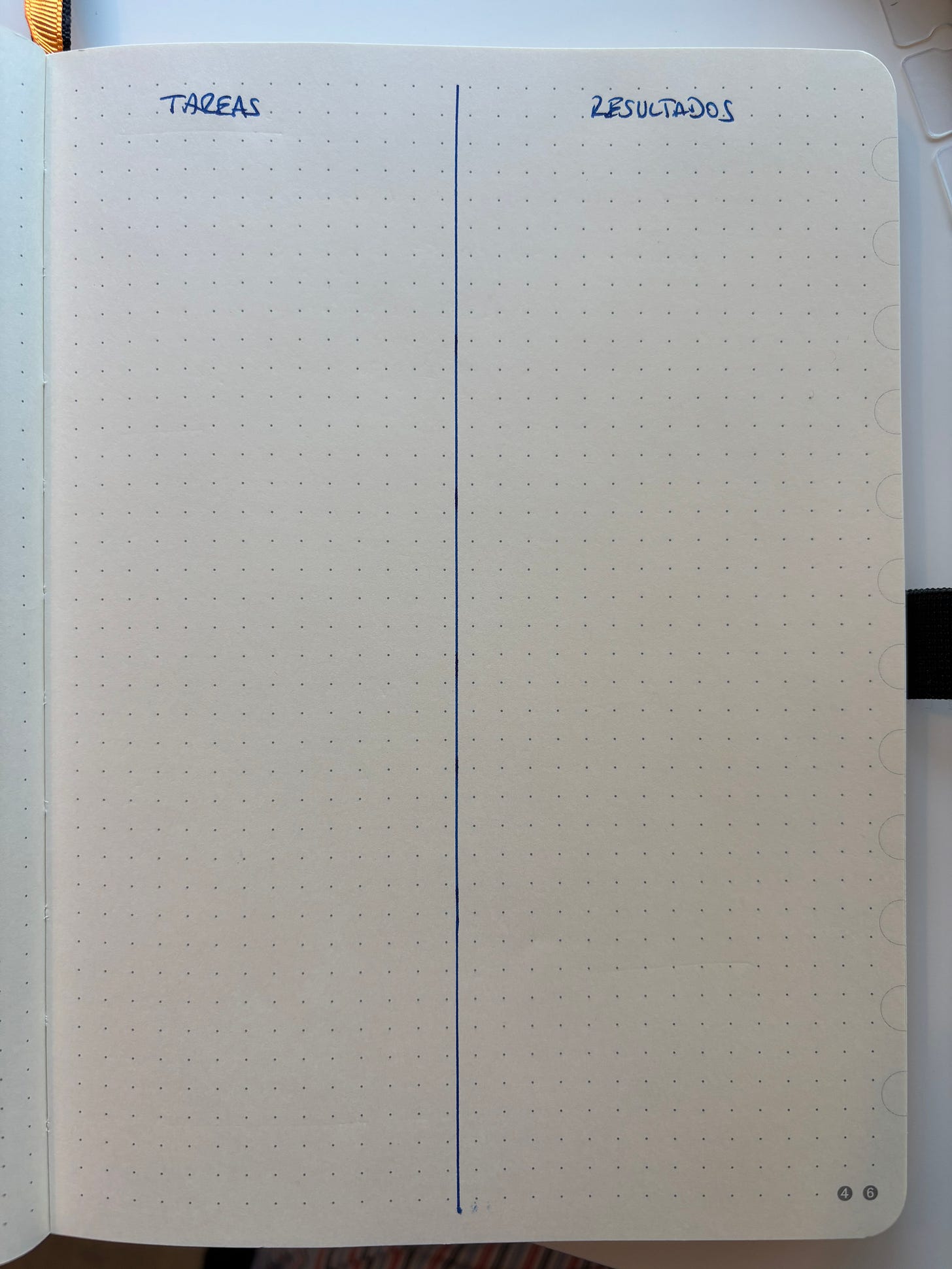 Abre tu cuaderno y pinta dos columnas en la página. En la columna izquierda escribe “Tareas” y en la columna derecha escribe “Resultados”.
